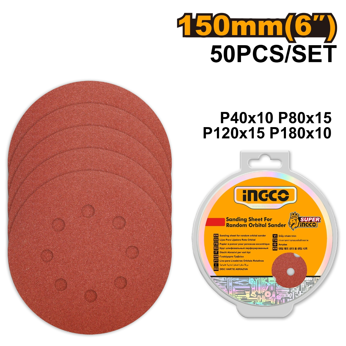 Size:150mm50Pcs/setP40x10pcs P80x15pcs P120x15pcs P180x10pcsSuitable for grinding wood, wall, paint, plastic, stone, metal, glassPacked by double blister